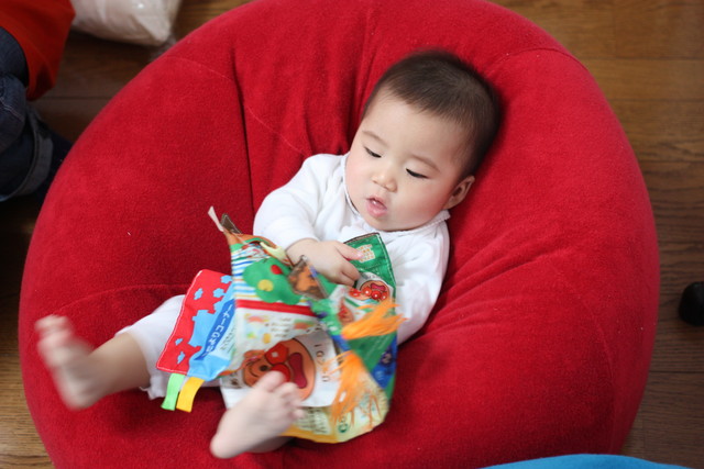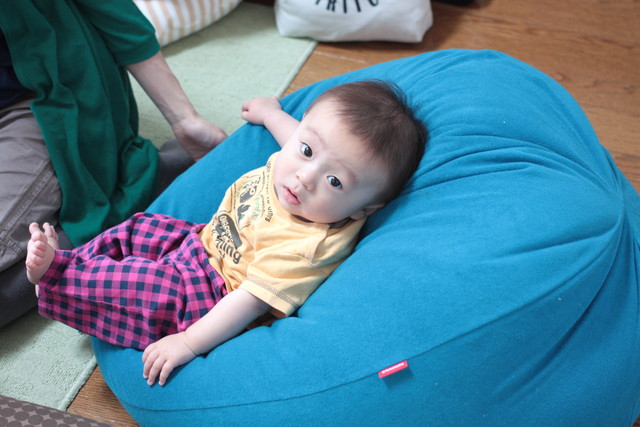 まずは、新作の大きめドーナツクッション(勝手に命名)とオニオンソファではるくん♪