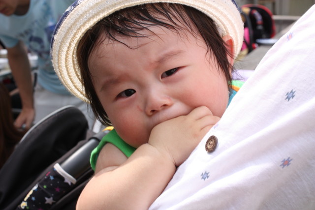 はるくん、眠くてご機嫌ナナメ。このあとベビーカーで小一時間お昼寝したら、元気になりました。