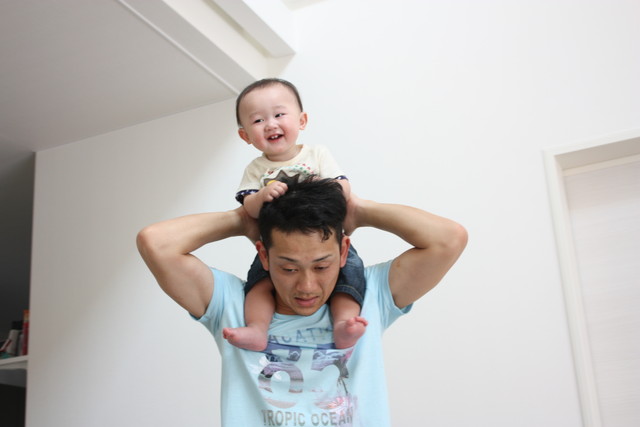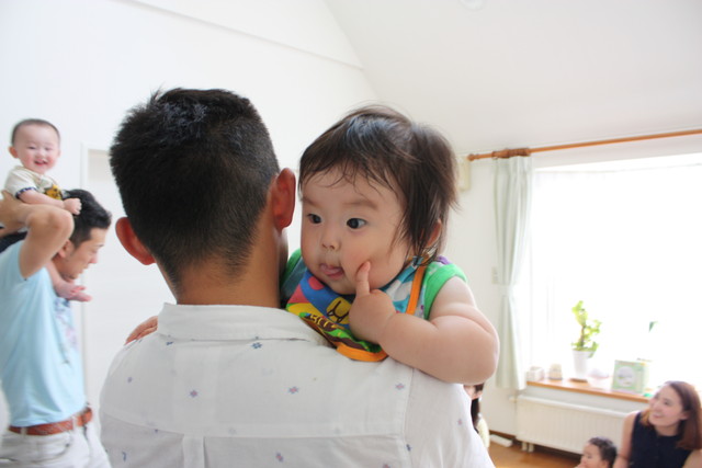 パパにだっこされて、はるくんゴキゲン。