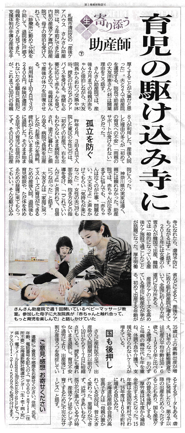 そして昨日と今日の2日間にわたって北海道新聞に、「寄り添う助産師」という特集記事が連載されたのですが、今日は後篇で産後ケアのお話。