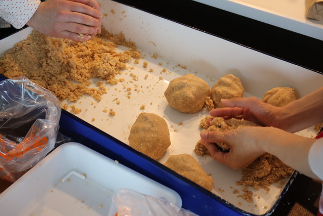 ほど良い硬さになったら、水分が逃げないようにお団子状にして、容器に詰めます。