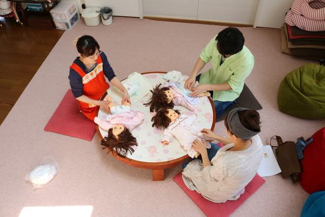 赤ちゃんのお世話編では、おむつ交換・お洋服の着せ方脱がせ方、沐浴の仕方などを体験していただきます。