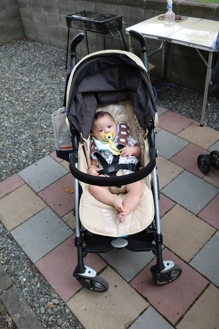 たいくん♪外での焼き肉には椅子代わりのベビーカーが必須です。