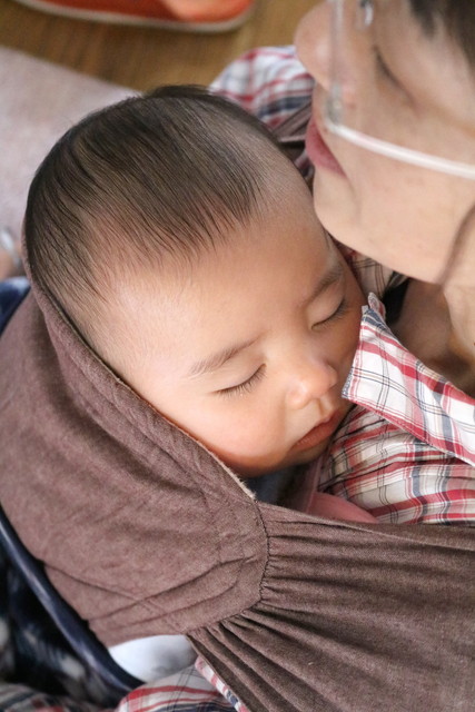 まずは、だっこひもの中で寝てしまったりょーくんを・・。