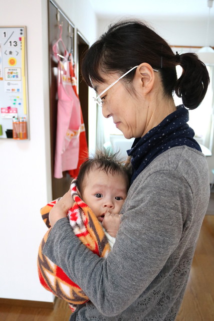 だっこの仕方やだっこ紐の使い方、しょおくんのお世話などわたしやっていることを見たり一緒にやったり・・。