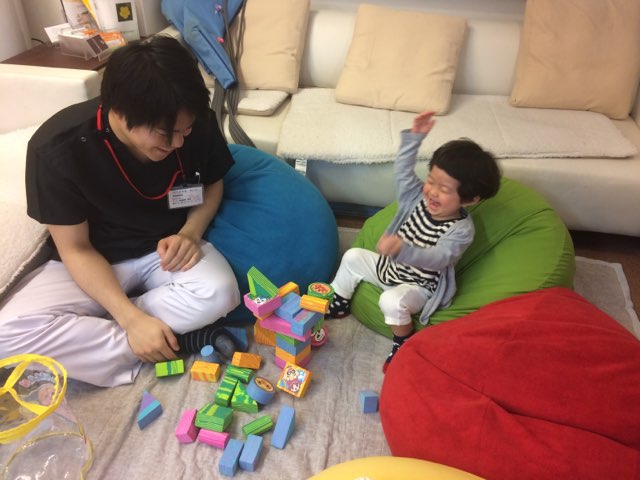 冬くんのお姉ちゃんの雪ちゃんは、最近スタッフに仲間入りした畠山先生とブロック遊び・・。