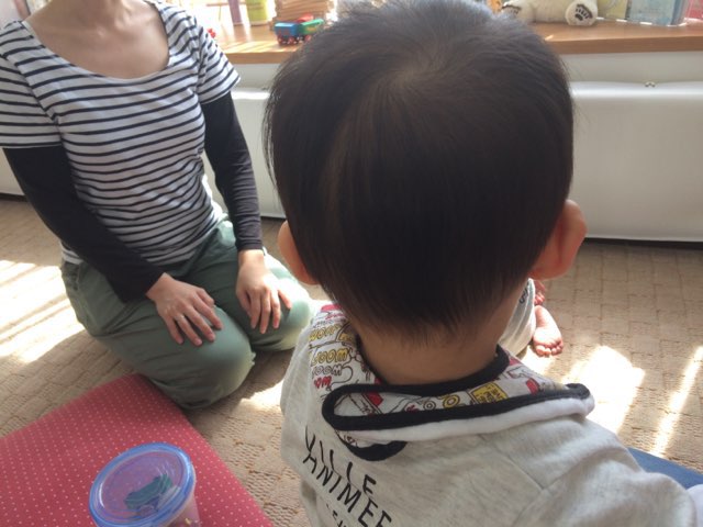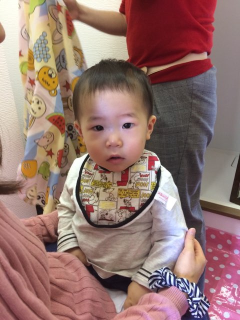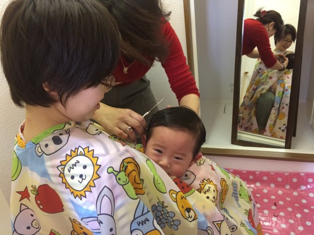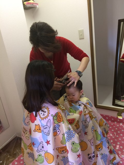 初カットにドキドキしながらもママの膝の上で、なんとか終了♪