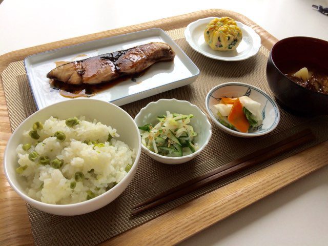今月のメニューは、“青豆ごはんとブリの照り焼き”