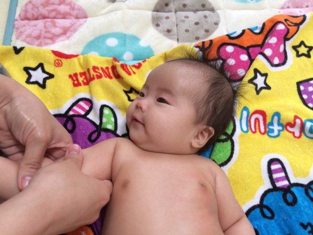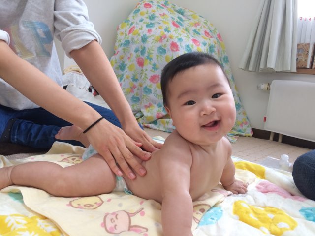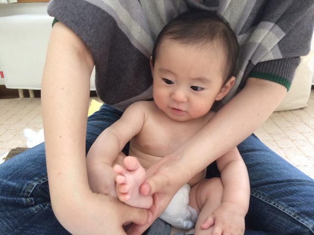とても元気に動くので、ママのお膝でマッサージ(^^;;
