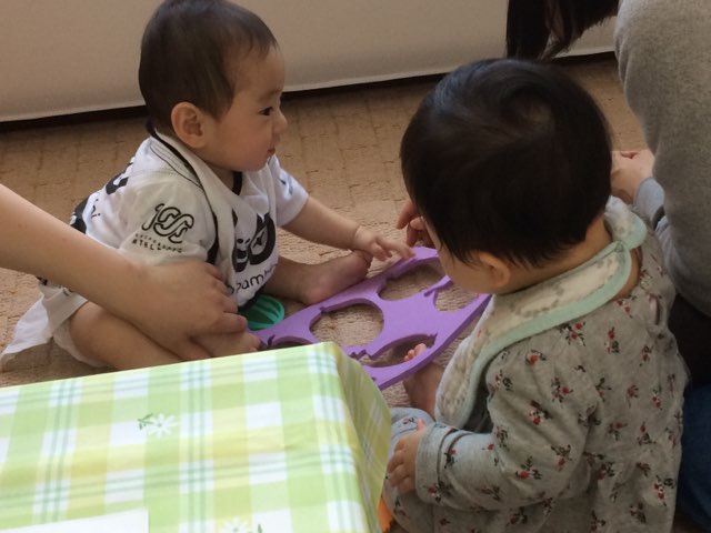 あおくん(写真左)とふうちゃん(写真右)は、仲良くパズルで遊び・・。