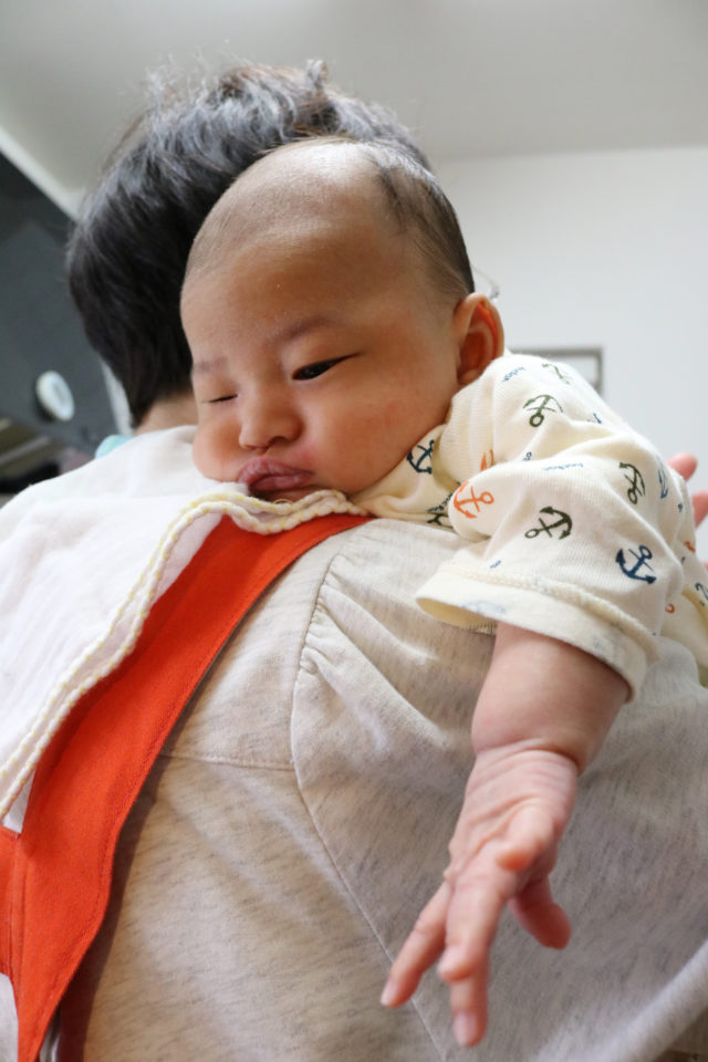 こちらは、ミルクをもらってげっぷが終わった後のはる坊。