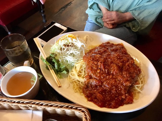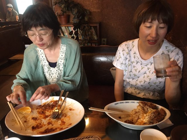 旧食事班はソースパスタ、さとちゃんはかつ丼、わたしはハンバーグミートを注文。