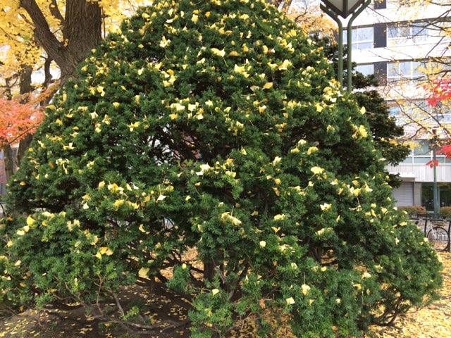 大通公園の紅葉もきれいだったのですが、松?の葉にイチョウの葉が落ちてクリスマスツリーっぽかったので、