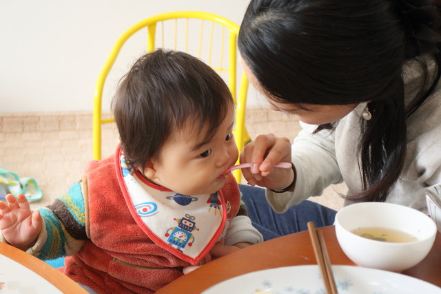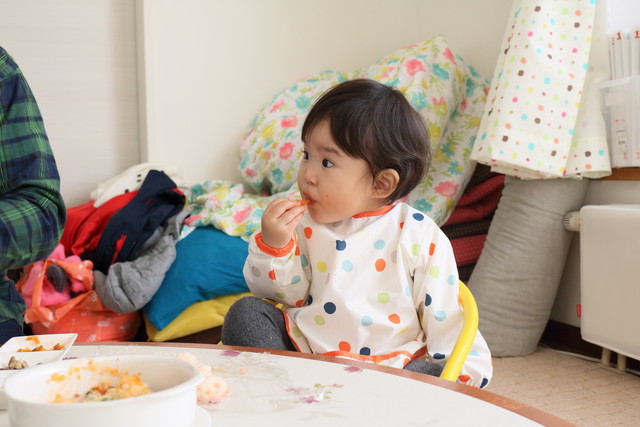 パパはお仕事のため来られなくて残念だったけど、ママが作った離乳食をパクパク( ^ω^ )