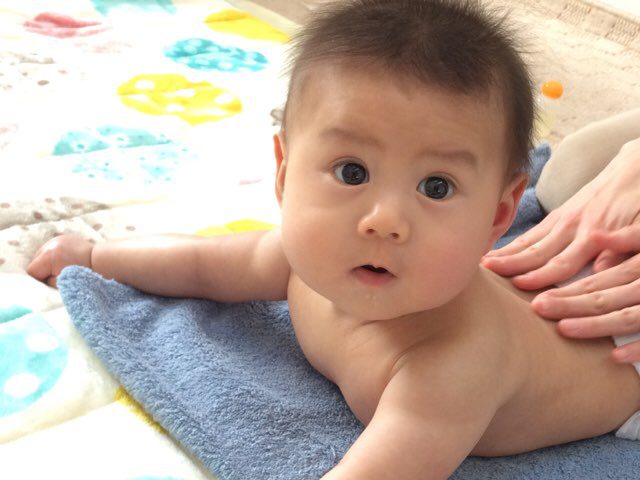 ママのマッサージは気持ちよくてニコニコなんだけど、カメラがこっちみてるとつい真顔になっちゃうのよね(*_*;