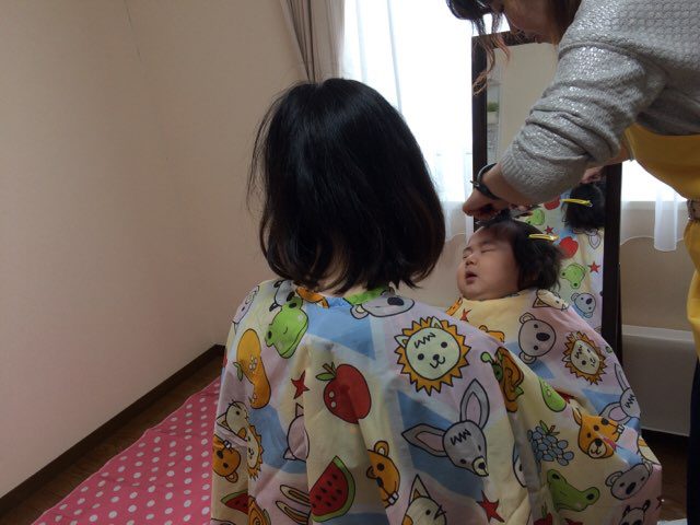 さんさん助産院では月に一度、しのさんが出張美容に来てくれるので、ママたちは他のお客さまに気兼ねすることなくカットしてもらうことができるのです。