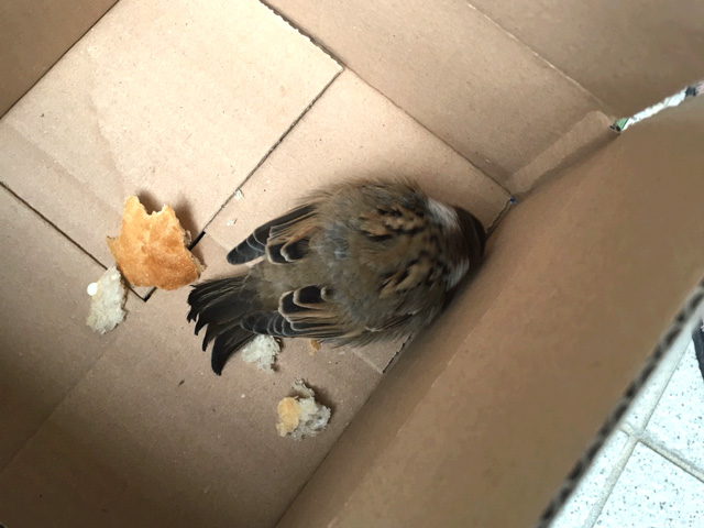 両手でそっと捕まえて、段ボールへ入れて、バゲットをあげて…。