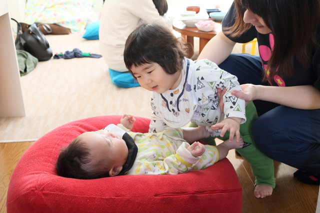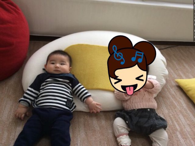 いとこ同士のれいちゃん(赤クッション)といちくん。