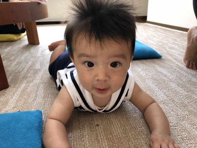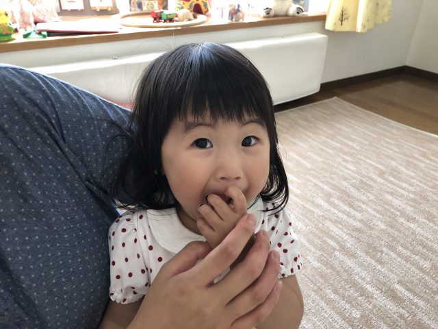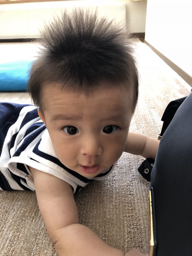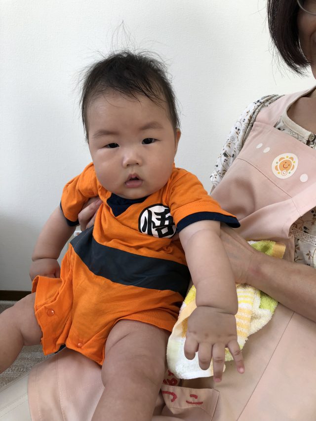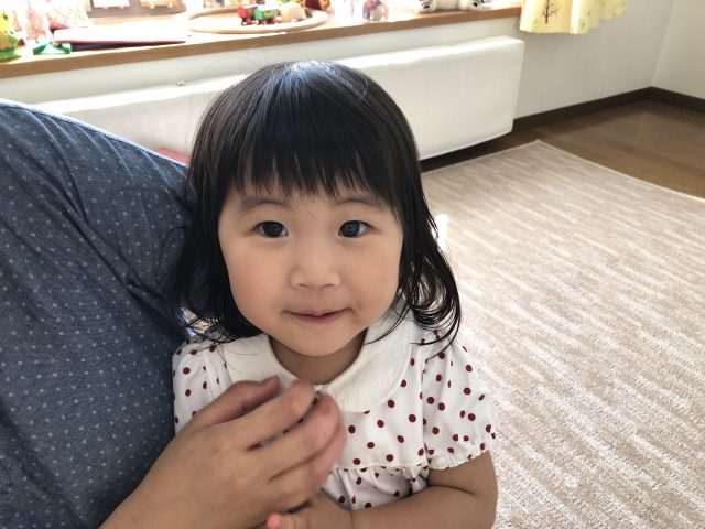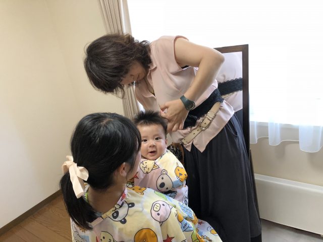 ママがだっこしながらしのさんが上手に髪の毛をカットしてくれるので、