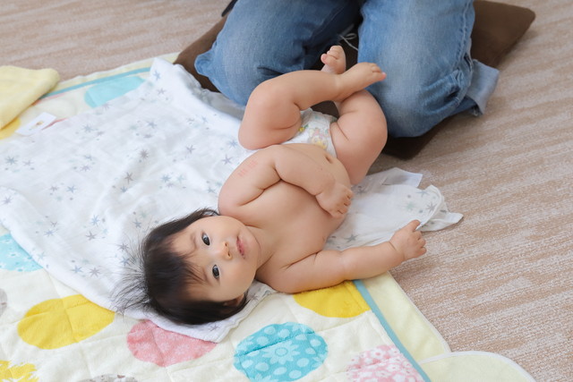なんと4か月で寝返りはするわ、ずりばいしそうになるわで成長著しいかわいこちゃん。