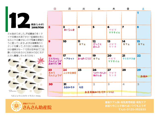 今日は12月のさんさん助産院のイベントをカレンダーとともにお知らせします。