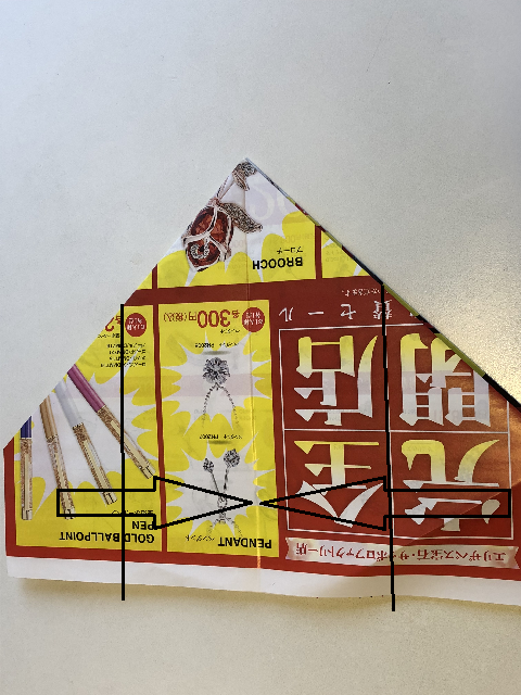 ③三角の部分が内側に来るように折り返したら、中心に合わせて折ります。