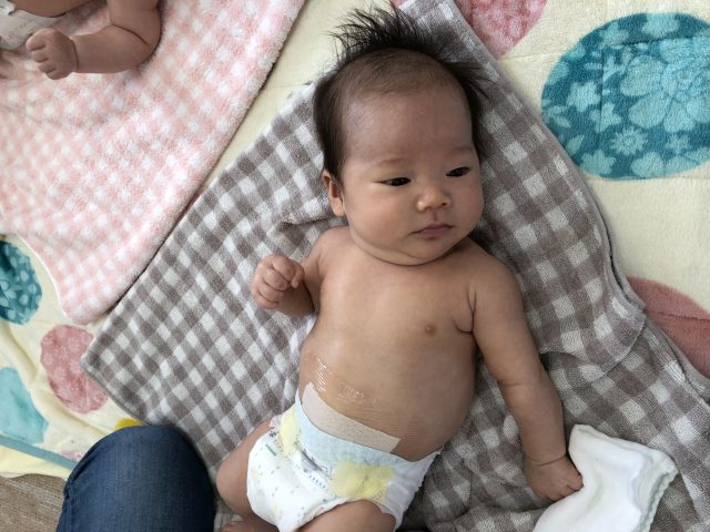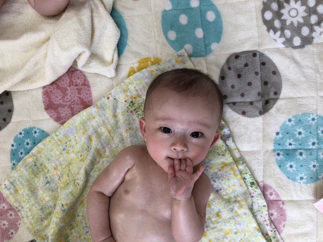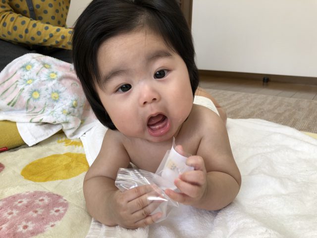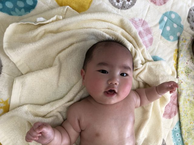 寝返りに加えて、回転しながらの移動が上手になってきました。