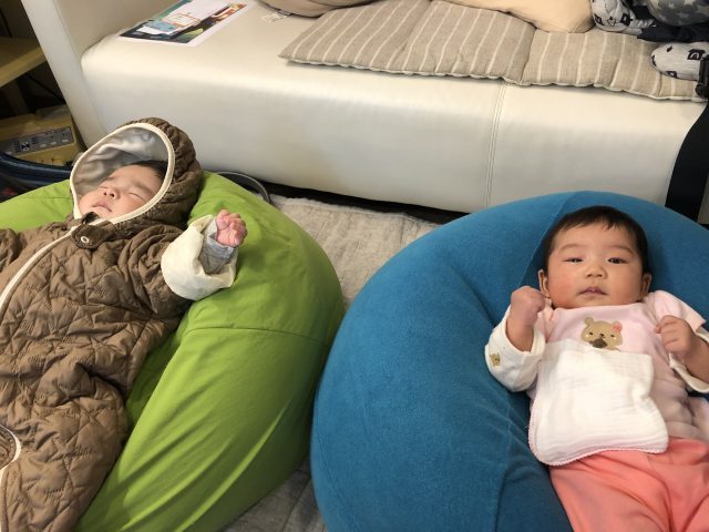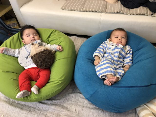 人見知り期突入前のお子ちゃまはクッションの上で遊んだり