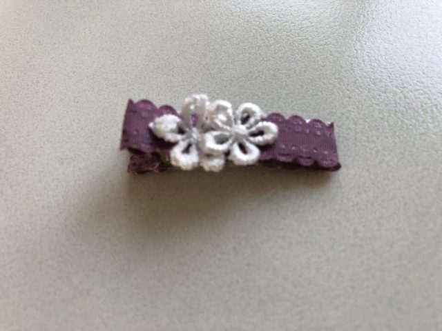ママがきーちゃんのために作ったヘアピンは、白地のチロリアン柄にお花を2個づけ。