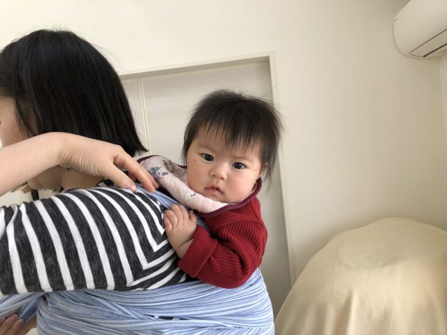産院で教えてもらったスリングの違うバリエーションのだっこの仕方を教えてもらったの。