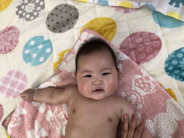 まだ生後2カ月だけど、ママのマッサージは気持ちいいよ~って顔してます♡