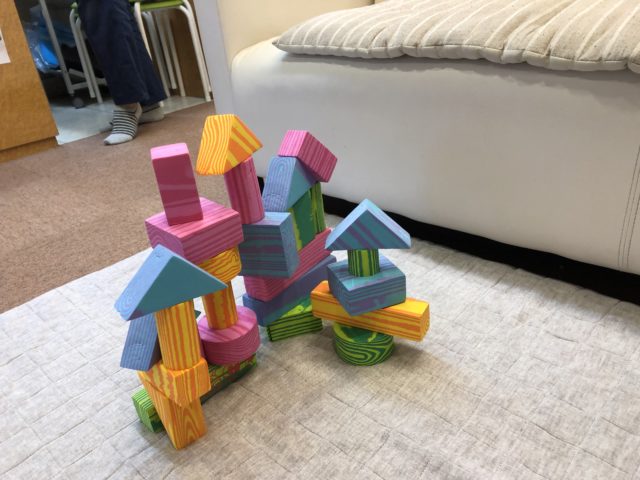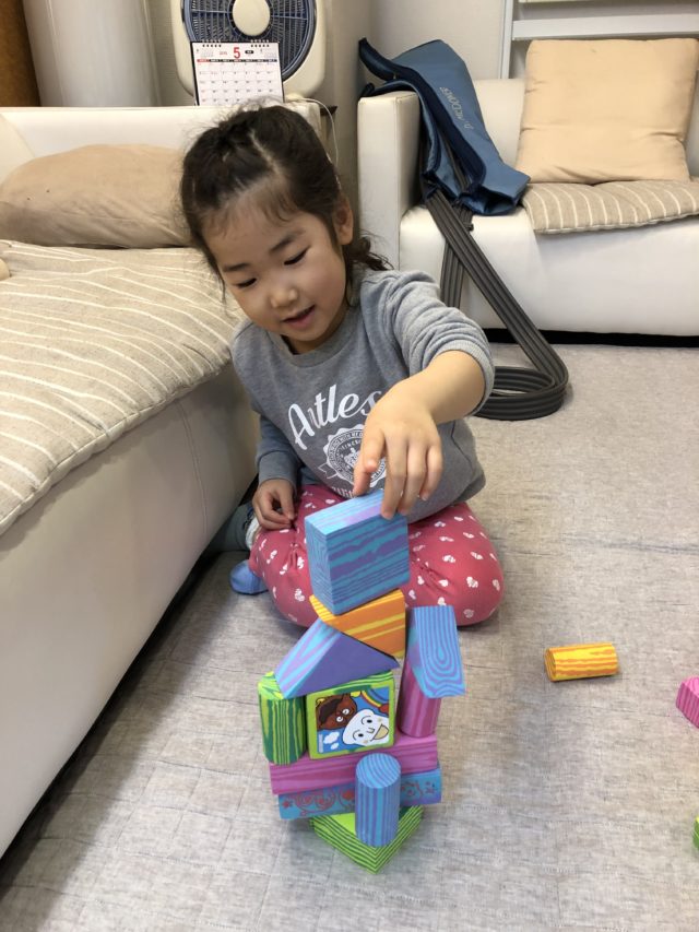 ふうくんのお姉ちゃんもママを待つ間、ブロックでお家を建設。