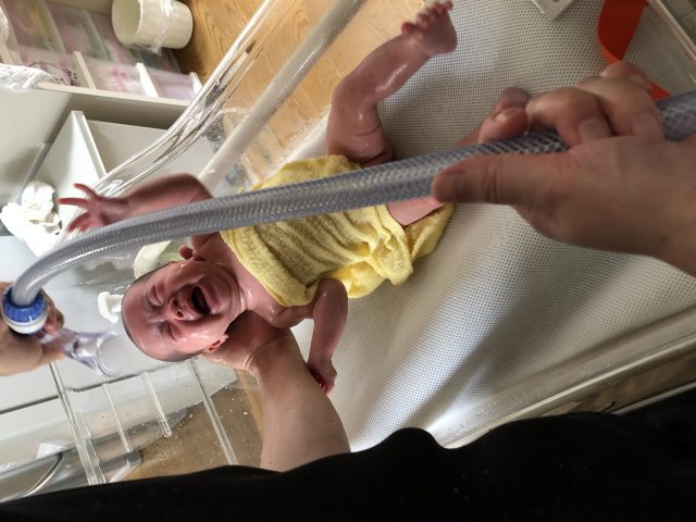 裸にされると泣いちゃって、パパが焦ってしまうので(笑)胸にタオルをかけてチャレンジ!
