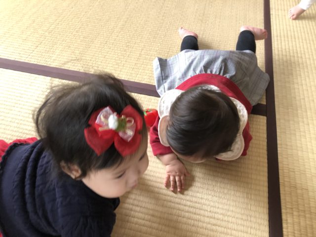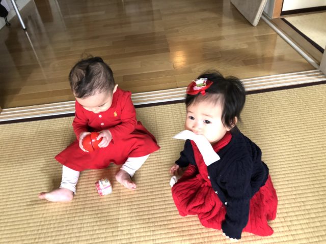 お口に何かを加えて動くのがマイブームのヒナちゃんと、ゆいちゃんのオモチャに夢中のこったん。