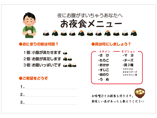 お部屋にお夜食リクエスト用紙がありますのでお好みの具と個数を書いてを院長までお渡しください。