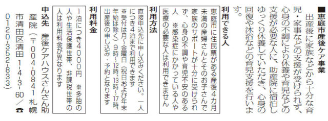 札幌市もそうですが、このような事業があっても知らない方が結構居られるようで、さんさん助産院に別の用事で来院されたママなどから「知ってたら利用したのに…」ということを良く耳にします。