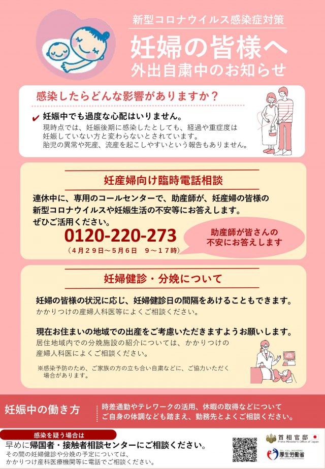 外出自粛要請が出ているこのGWに妊産婦さん向けの臨時電話相談が設置されるそうなのでご紹介します。