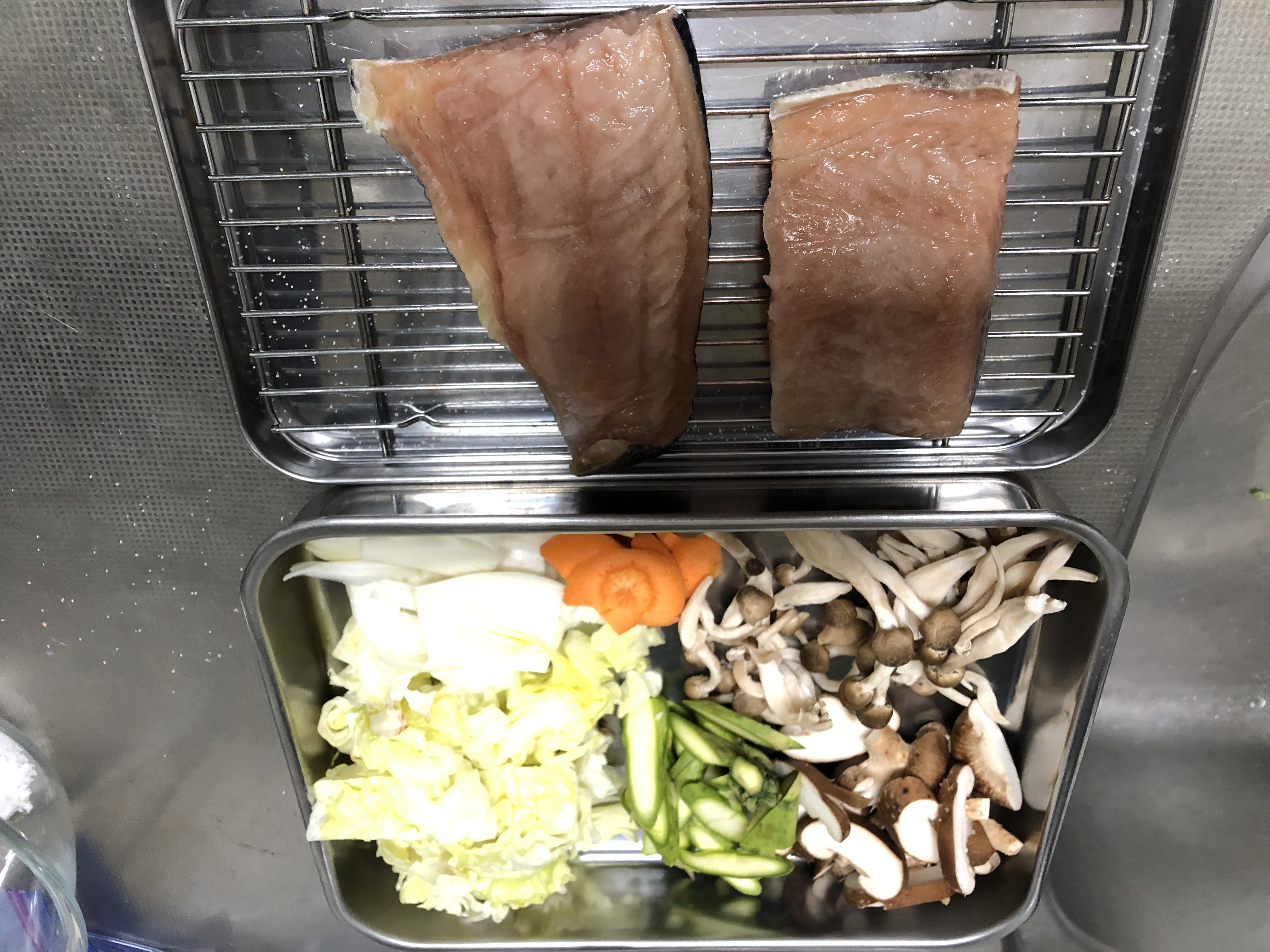 ①生サケに塩を振り身がしまるのを待っている間に野菜を切ります。