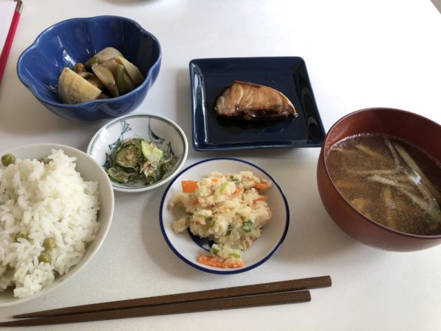 この日のお昼ごはんは、お昼ごはんに出した青豆ごはんとぶりの照り焼き。