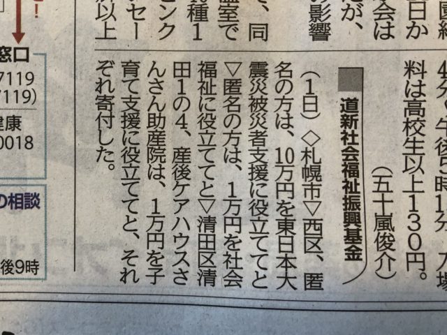 そこに、さんさん助産院の想いをのせて、合計10,000円を北海道新聞社会福祉振興基金さまに募金しました。