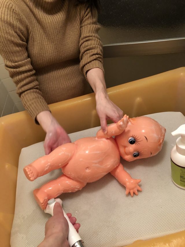 シャワー沐浴の練習は、妊婦さんにもご主人にもちゃんと練習してもらいます。