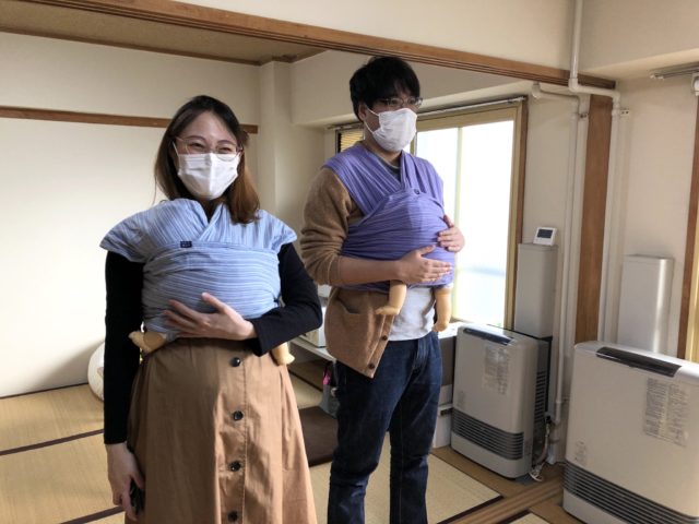 ご主人にキャリータイプのだっこひもを試着してもらった後、妊婦さんも試着できるスリングとへこおびにチャレンジ♪