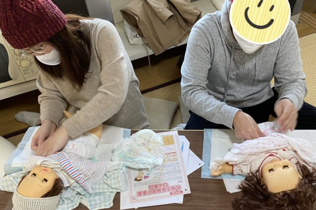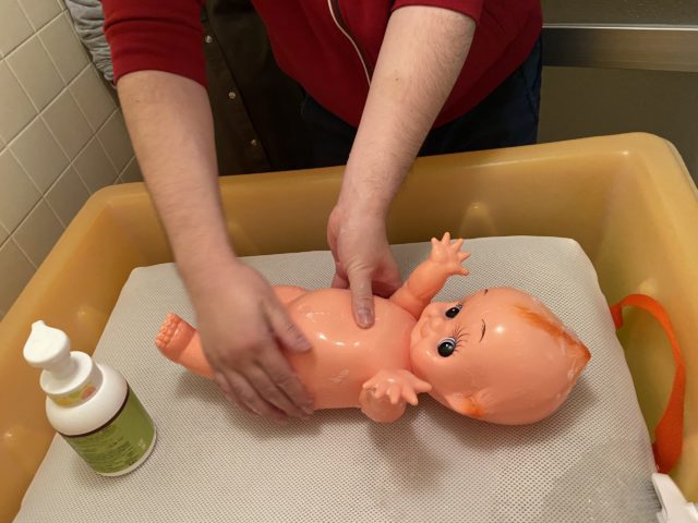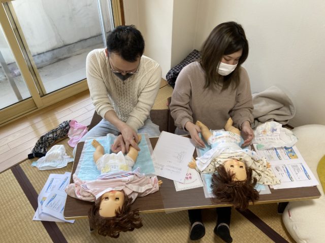 そして、休憩を挟んで赤ちゃんのお世話の練習です。