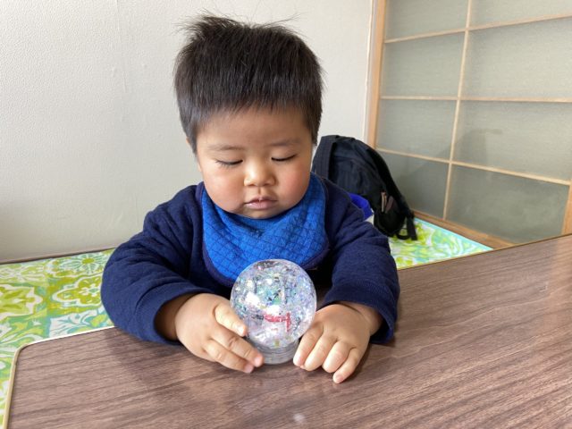 雪ダルマのスノードームを嬉しそうに見つめているのは、お久しぶりのたっくん。