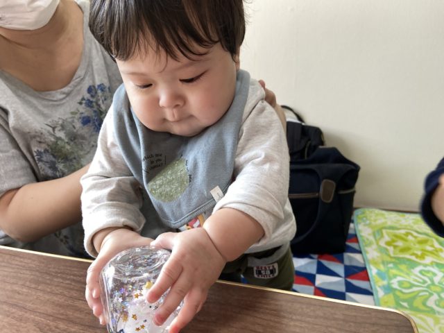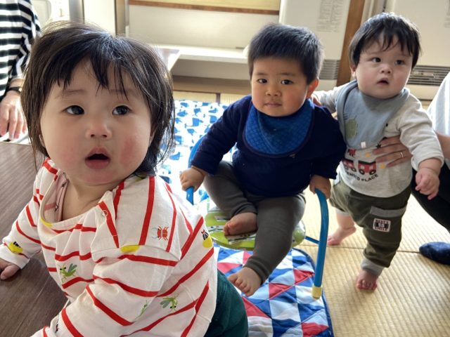 この間ベビマに来てくれたばかりだったのに、もうつかまり立ちしてました・・。