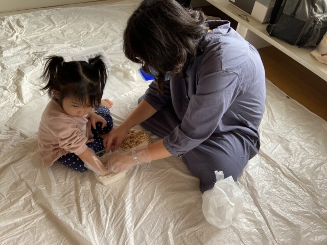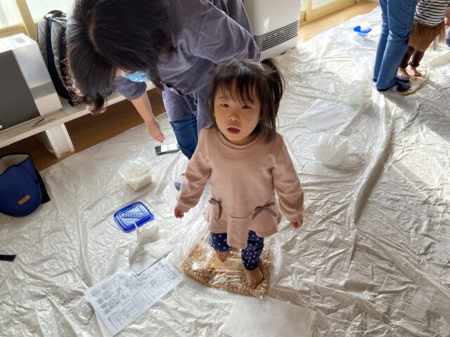 もんめに来たときはギャン泣きだったけど、すぐに慣れてママと一緒に麹と塩を混ぜているのは、うっちゃん2歳♡