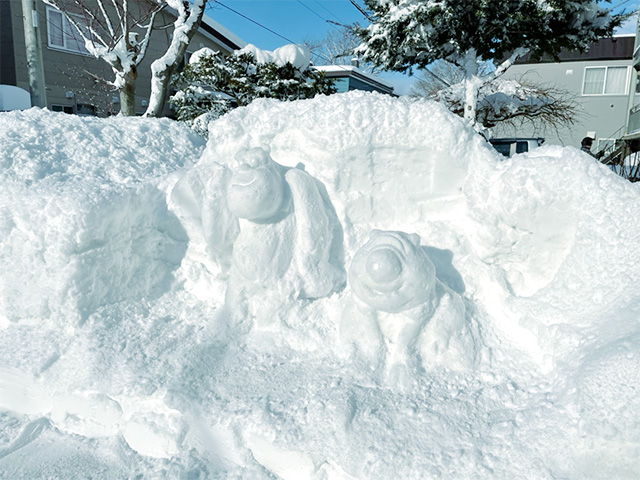 今年も雪が降ってからお隣さんに許可を頂きまして、今年は何にしようかなーって雪像の事を考えてきましたがなんせ今年は雪が少なく、大丈夫かなーって不安でした。