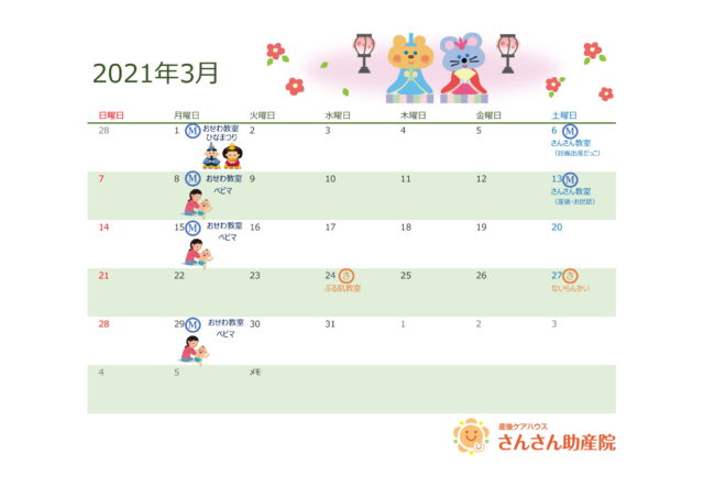 3月は、ベビーマッサージ教室のほかに、ひな祭りも開催します。