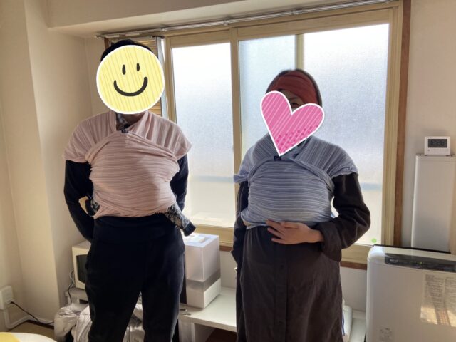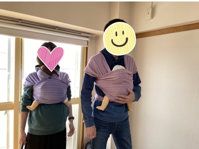 スリングやへこおびなどの布製のだっこひもは妊婦さんでも試着できるので、みんなでチャレンジ!