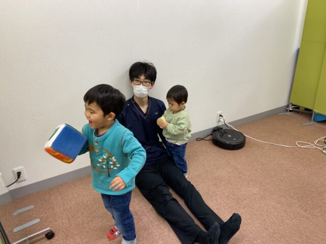 仲良し兄弟は、お気に入りの齋藤先生と仲良く遊んでママを待ちます。